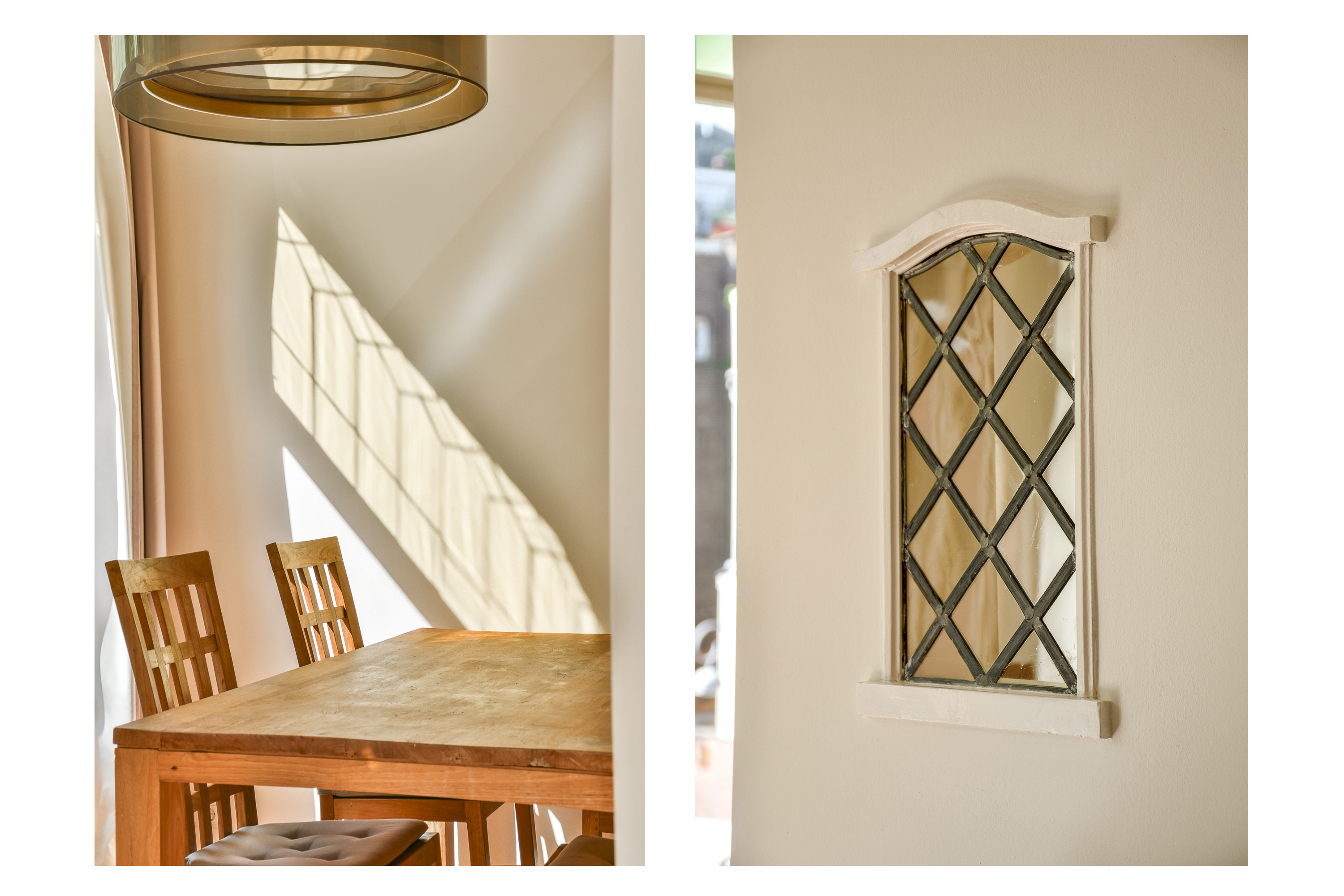 - The living room is located at the front and features large windows with characteristic stained glass, as well as French doors opening onto the sunny balcony;