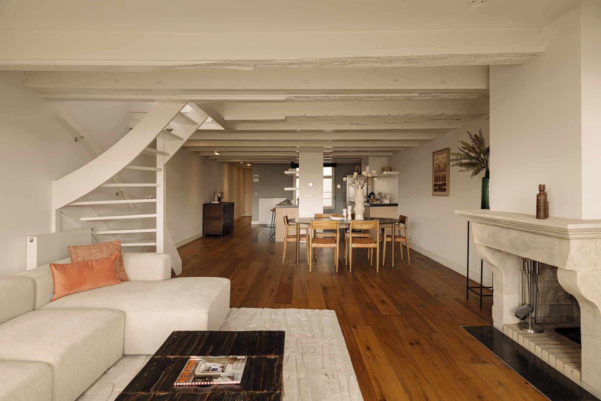 - Deze verdieping omvat een riante, open doorzonwoonkamer met grote raampartijen, een karakteristiek balkenplafond en een sfeervolle, originele schouw;