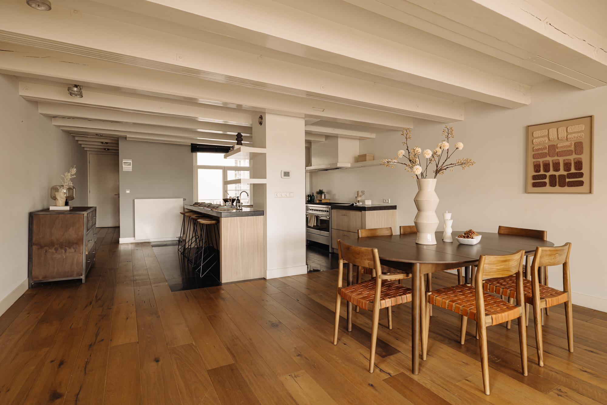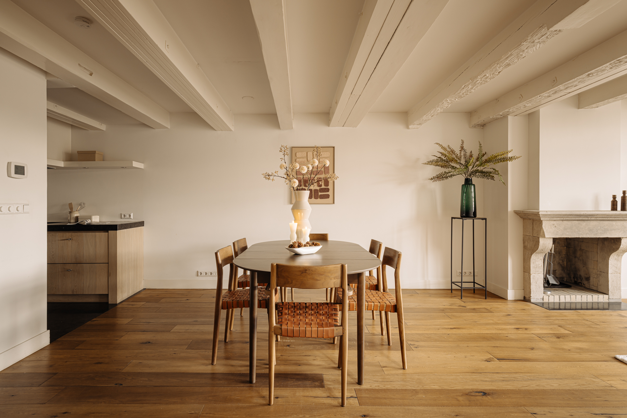 - De gehele woning beschikt over een prachtige, eikenhouten vloer en een karakteristiek balkenplafond;