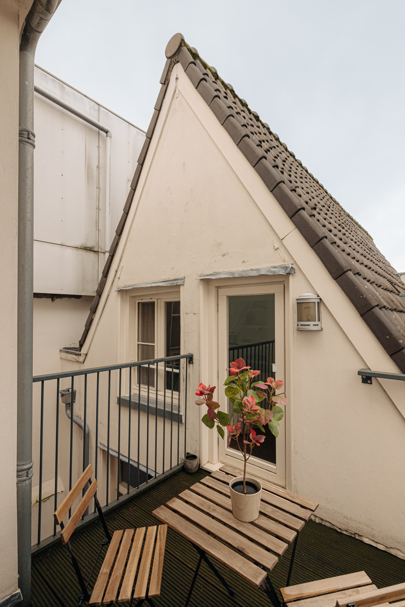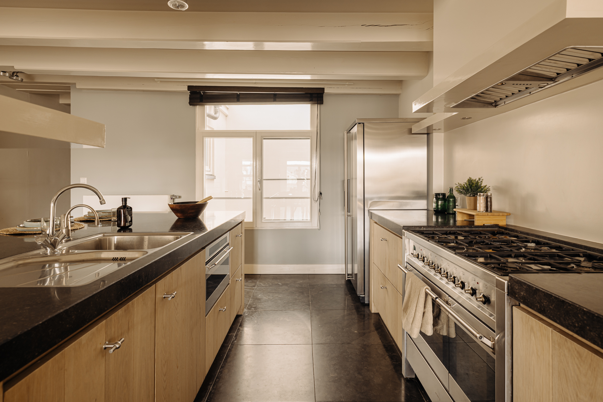 The home has high-quality finishes and plenty of natural light. The entire home has beautiful oak flooring and characteristic beamed ceilings. With a spacious living area, luxury kitchen, two large bedrooms, and a sunny balcony, this home offers everything you would expect from high-quality living in the city center.