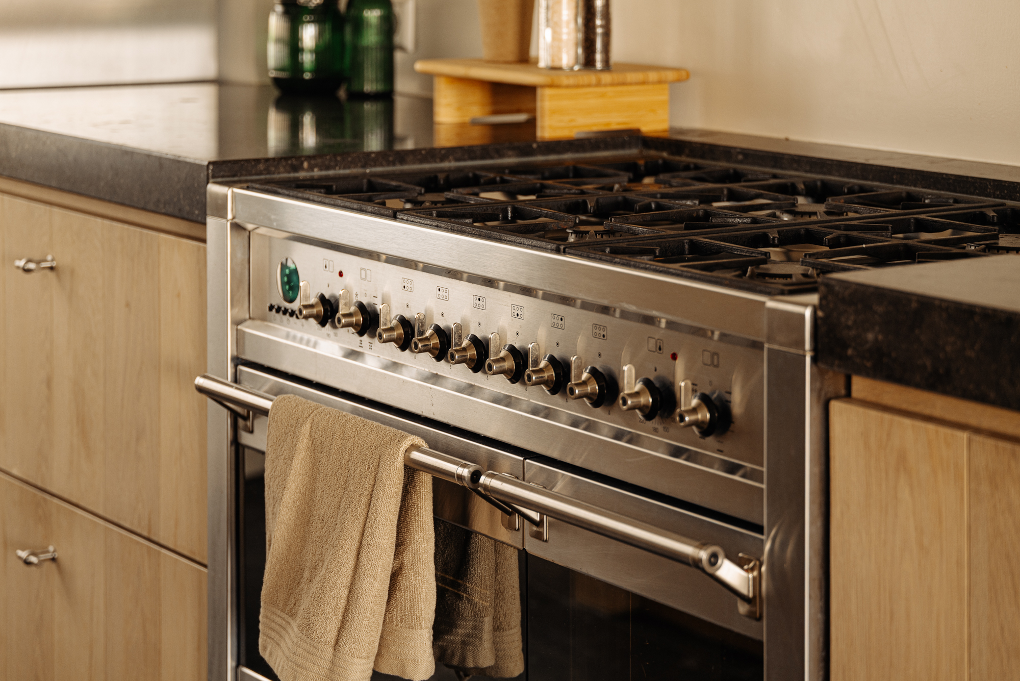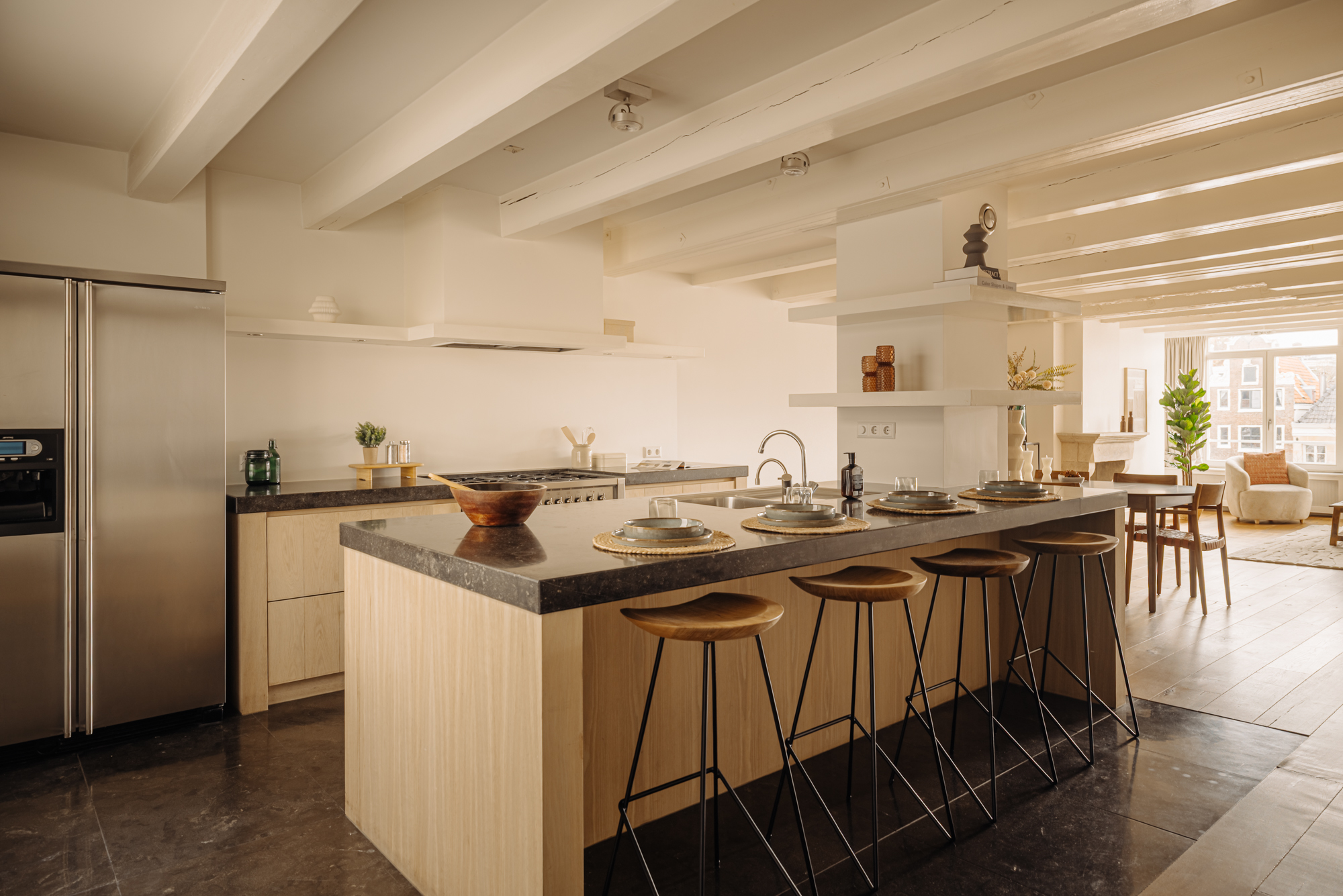 - The luxurious open-plan kitchen is equipped with a sink island, a Belgian bluestone countertop, and high-quality built-in appliances, realized by JVD-Keukens;