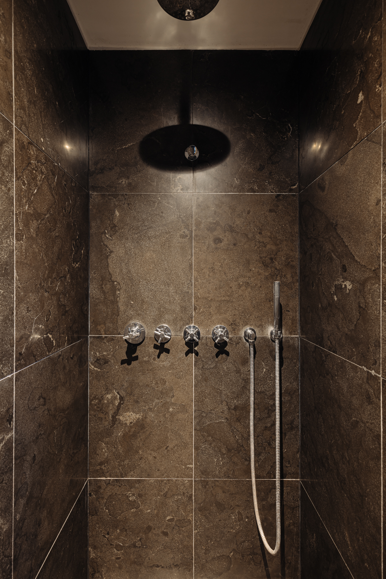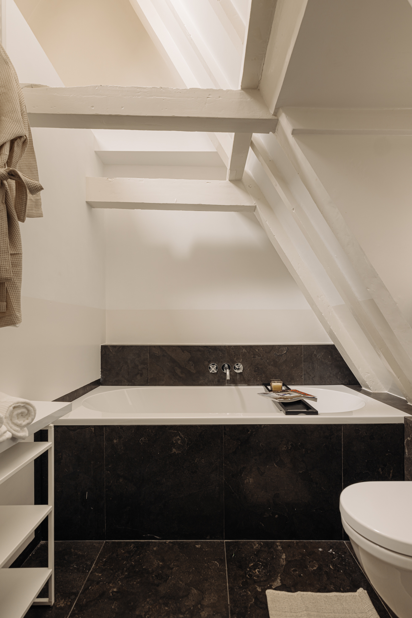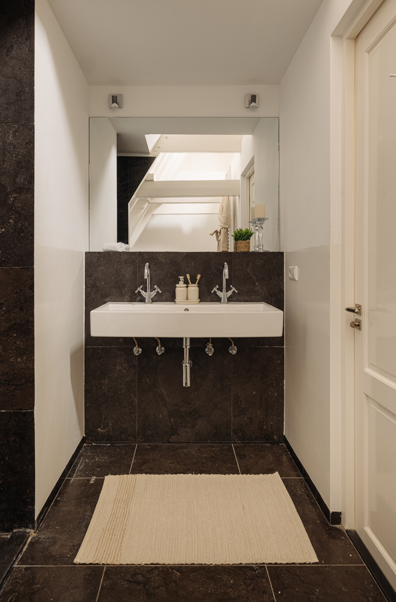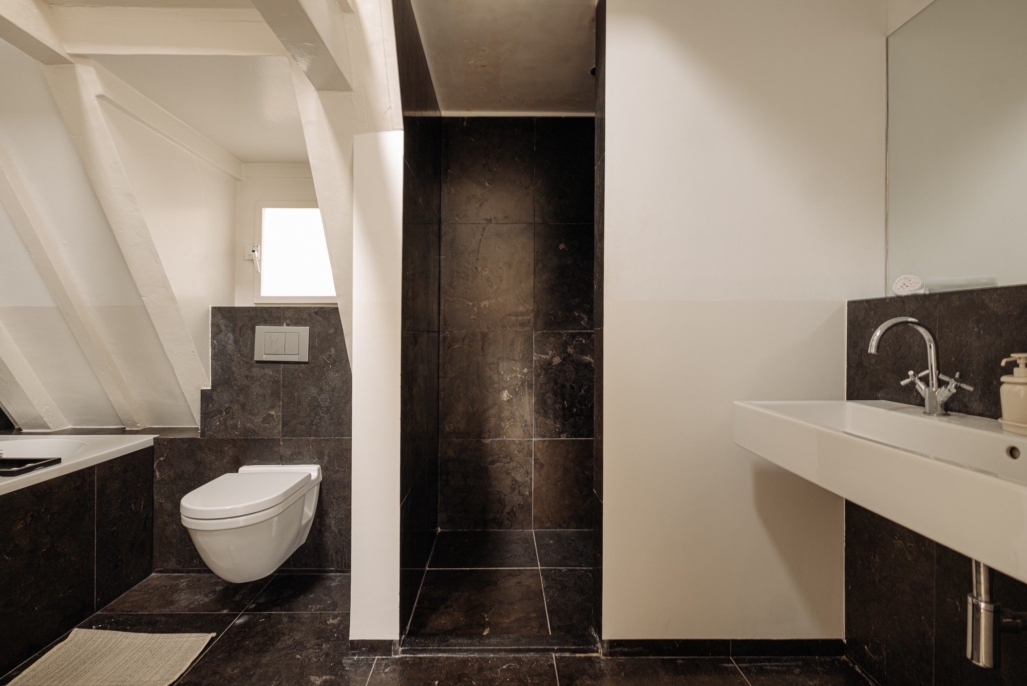 - De centraal gelegen badkamer is uitgerust met een ligbad, een inloopdouche met regendouche, een dubbele wastafel met spiegel en een elektrisch te openen dakraam;