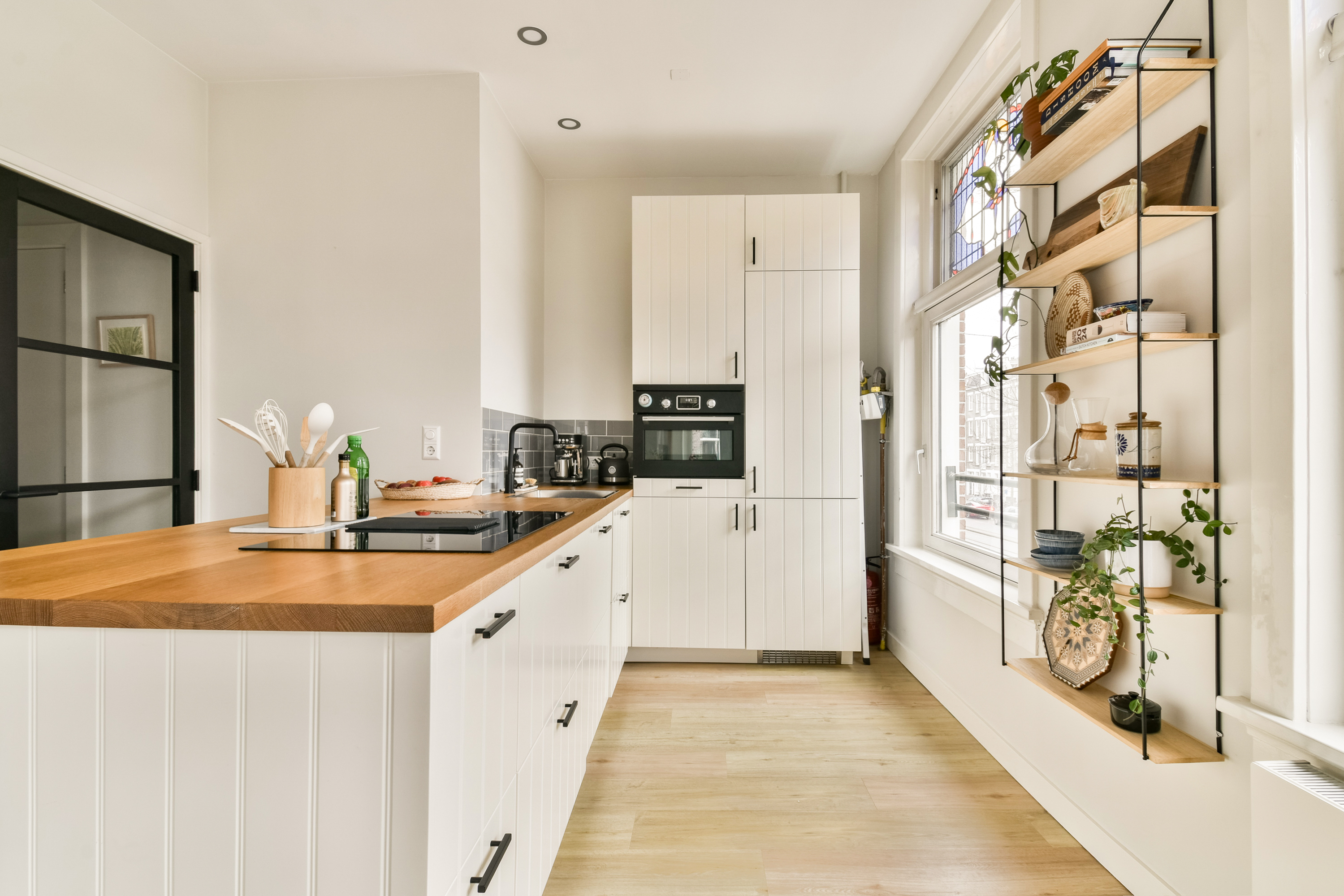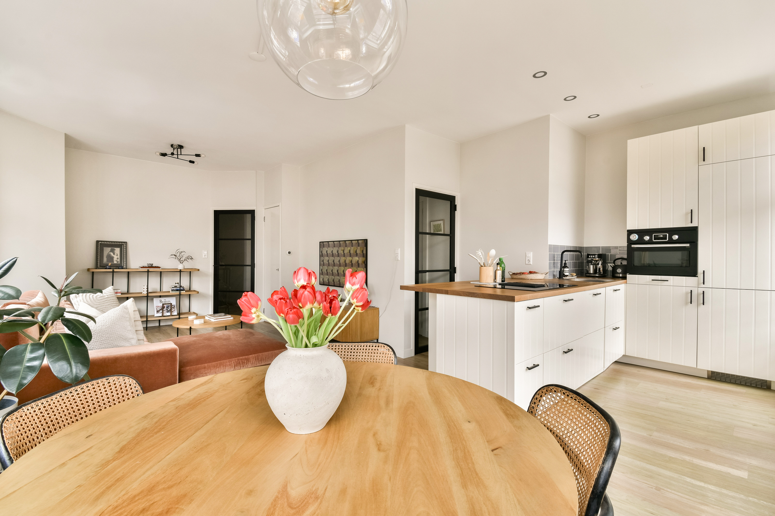 - Moderne open L-keuken, uitgerust met diverse inbouwapparatuur zoals een koel-/vriescombinatie, combi-oven, vaatwasser en een inductiekookplaat met geïntegreerde afzuiging.