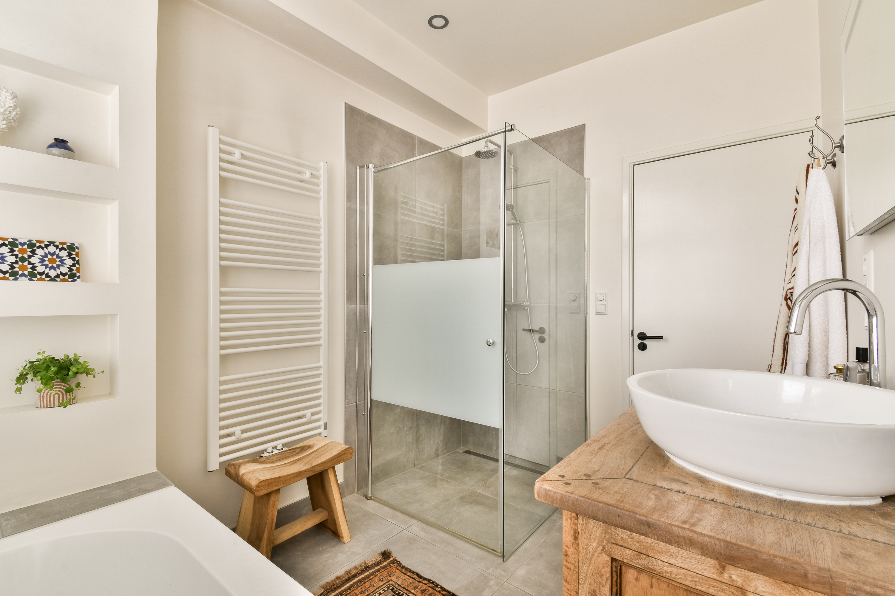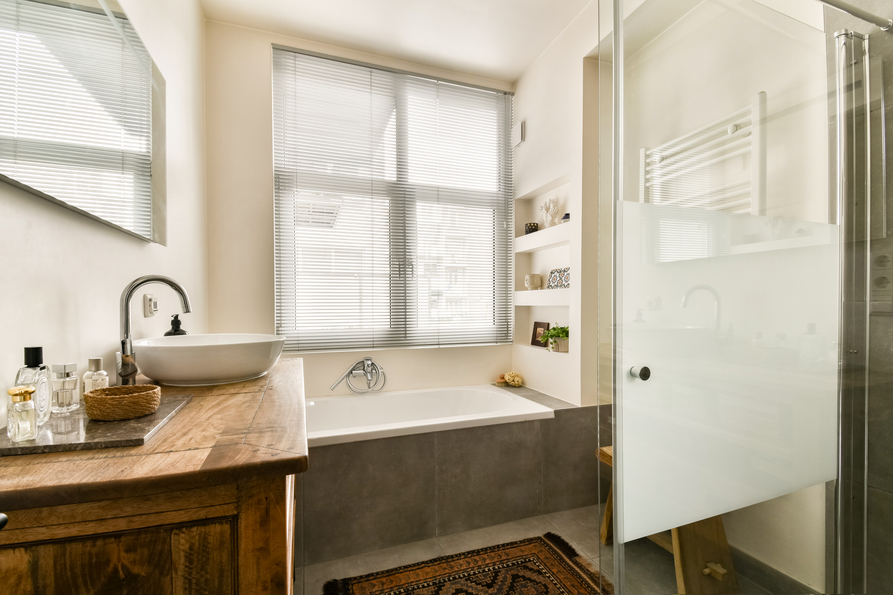 - Moderne badkamer met een groot raam en voorzien van ligbad, inloopdouche, wastafelmeubel, design radiator en vloerverwarming.