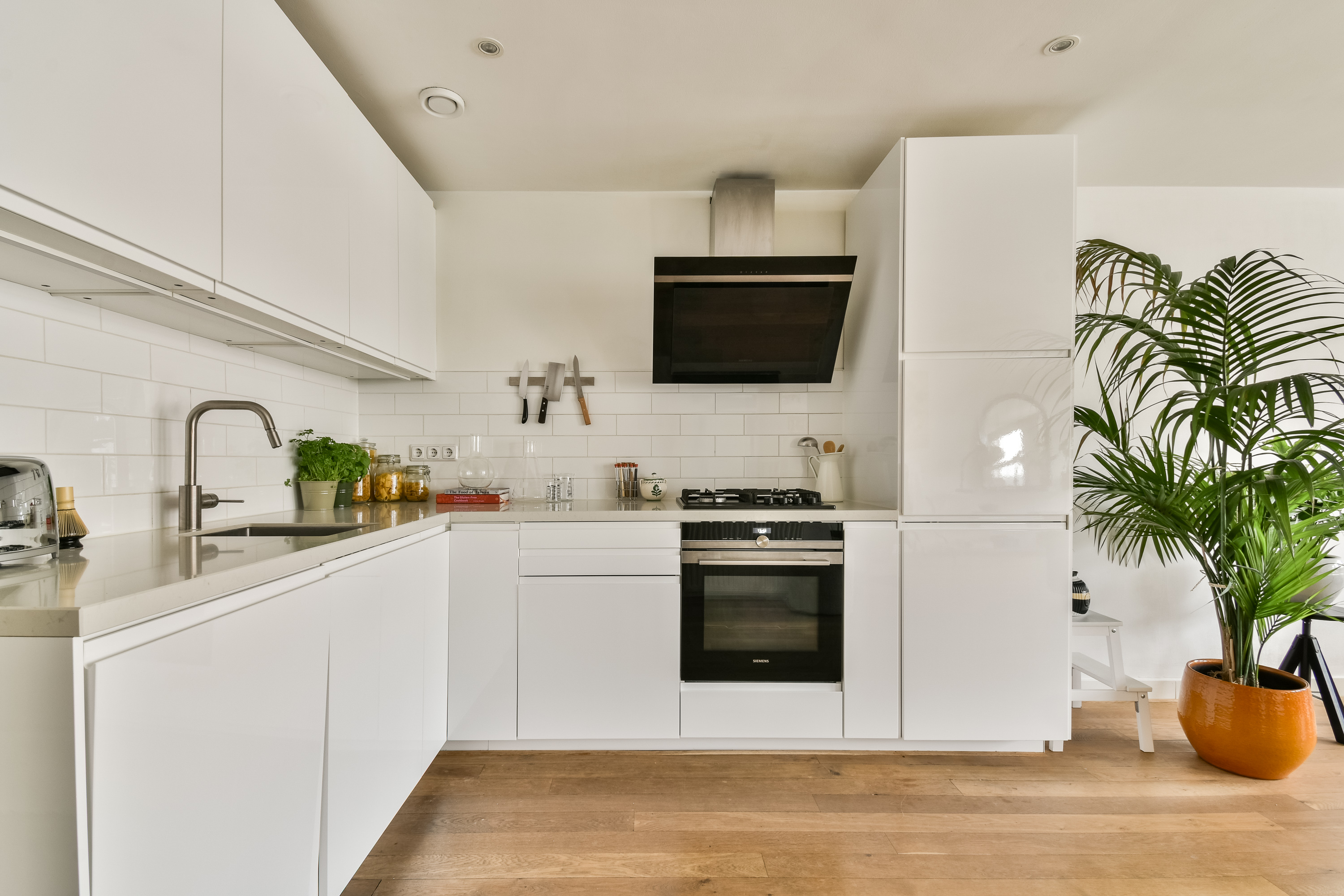 - Modern open corner kitchen equipped with built-in appliances including a dishwasher, fridge-freezer, gas hob, extractor hood, and oven;