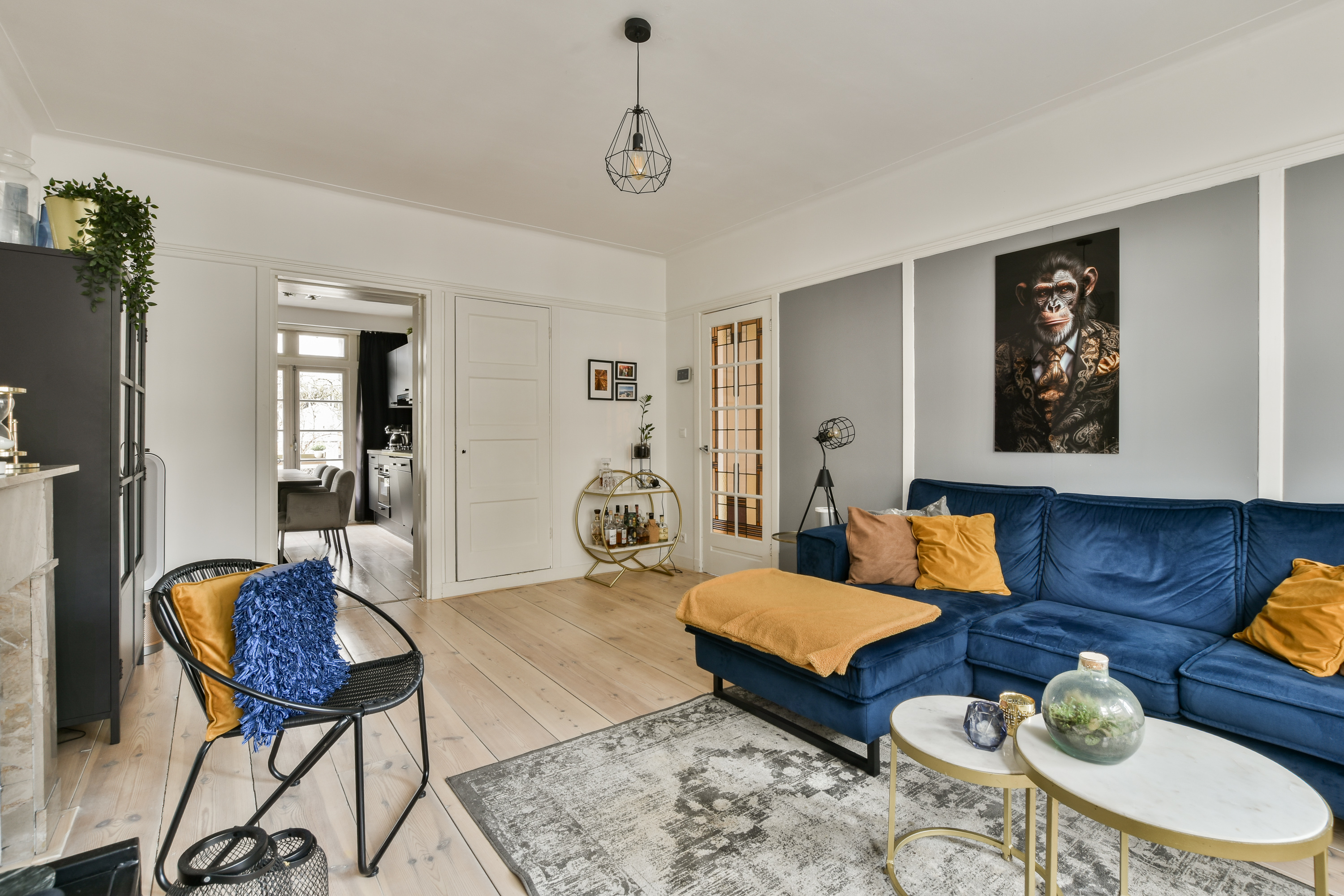 Distinctive elements such as stained glass doors, an attractive bay window, high ceilings, and a natural stone fireplace give the home a stylish look. With an area of approximately 85 m², multiple bedrooms, and possibilities on the upper floor, this is a surprisingly spacious apartment.