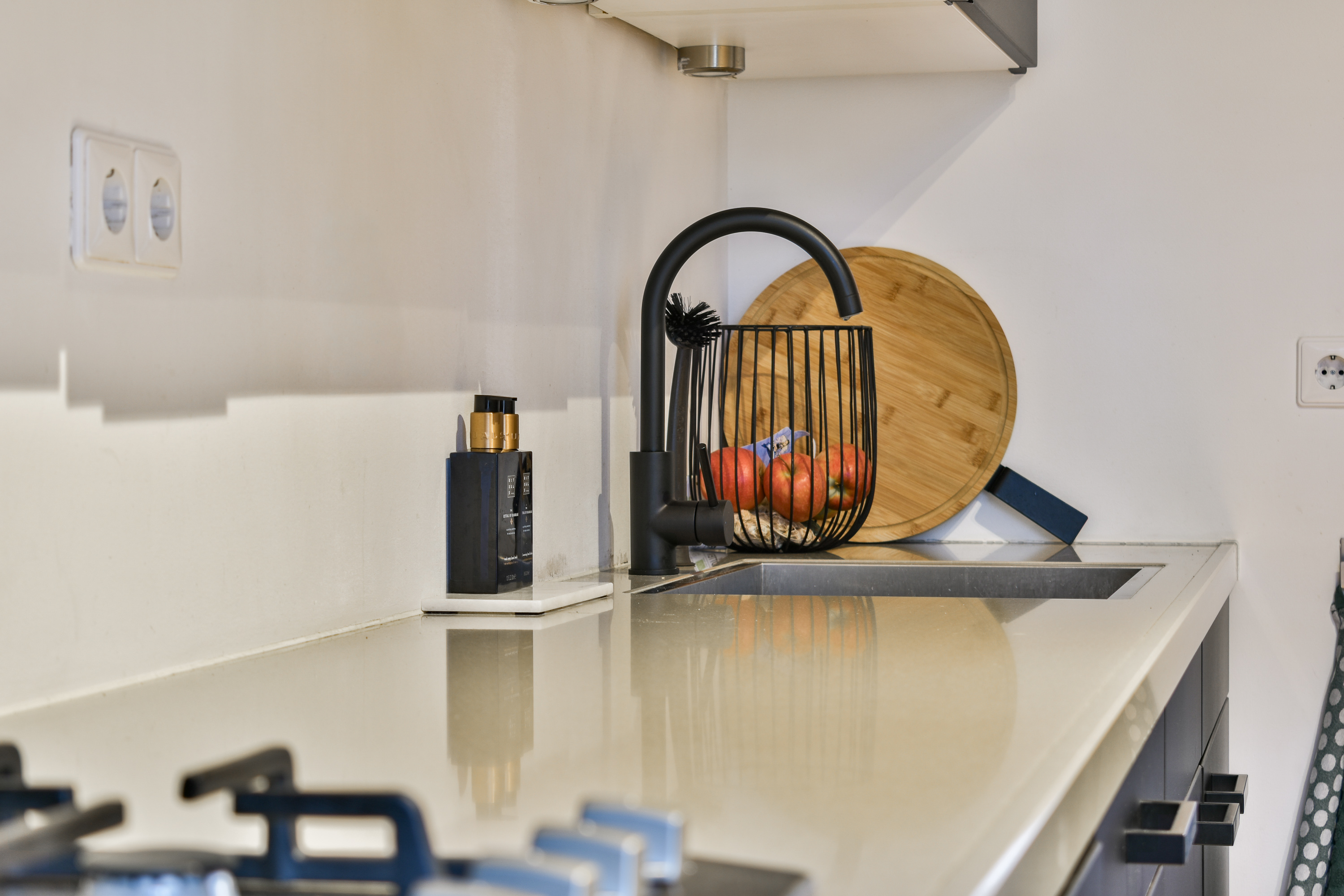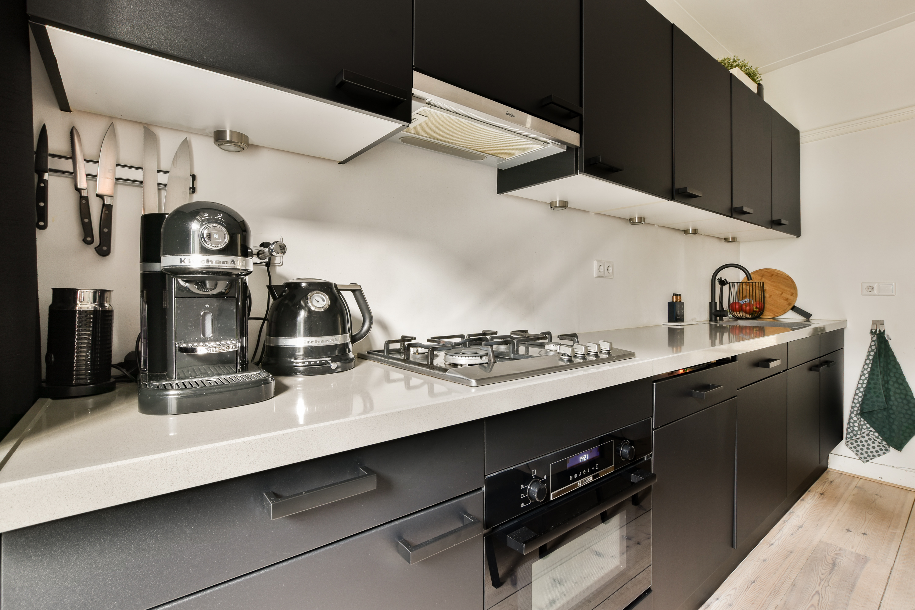 - De keuken is voorzien van een licht aanrechtblad, donkere keukenkasten met geïntegreerde inbouwspots en diverse inbouwapparatuur, waaronder een 4-pits gasfornuis, Bosch combioven, vaatwasser en wijnklimaatkast;