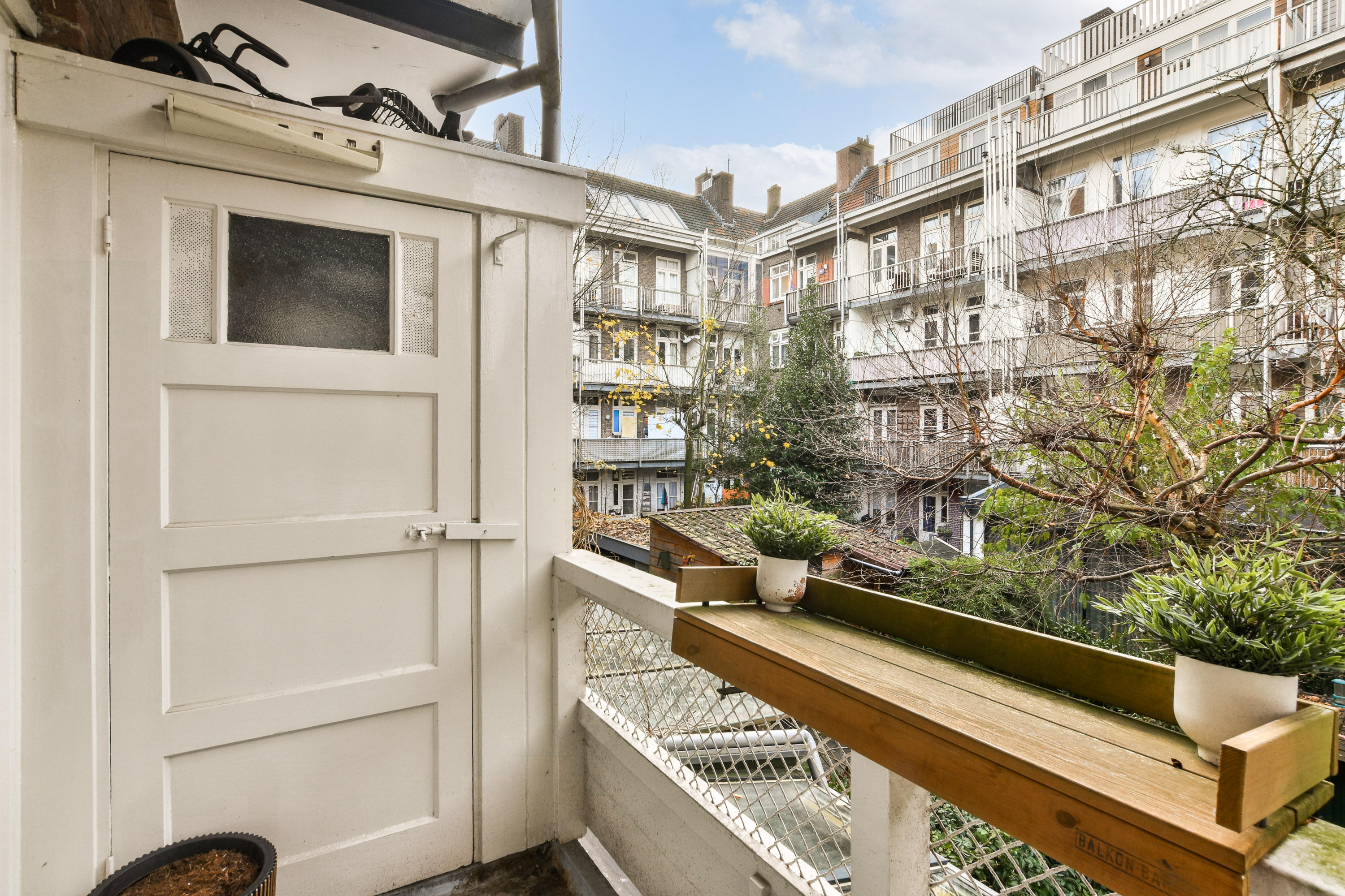 - French doors lead to the west-facing balcony, where the central heating boiler is also located.
