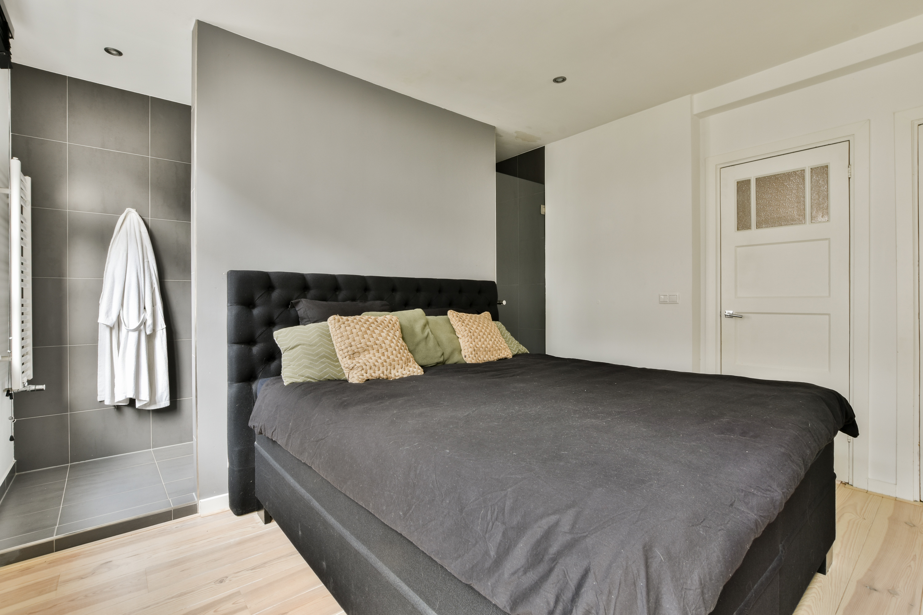 - De ruime master bedroom is rustig gelegen aan de achterzijde van het appartement en beschikt over een grote kastenwand, ruimte voor een tweepersoonsbed en een ensuite badkamer met inloopdouche, wastafelmeubel en handdoekradiator;