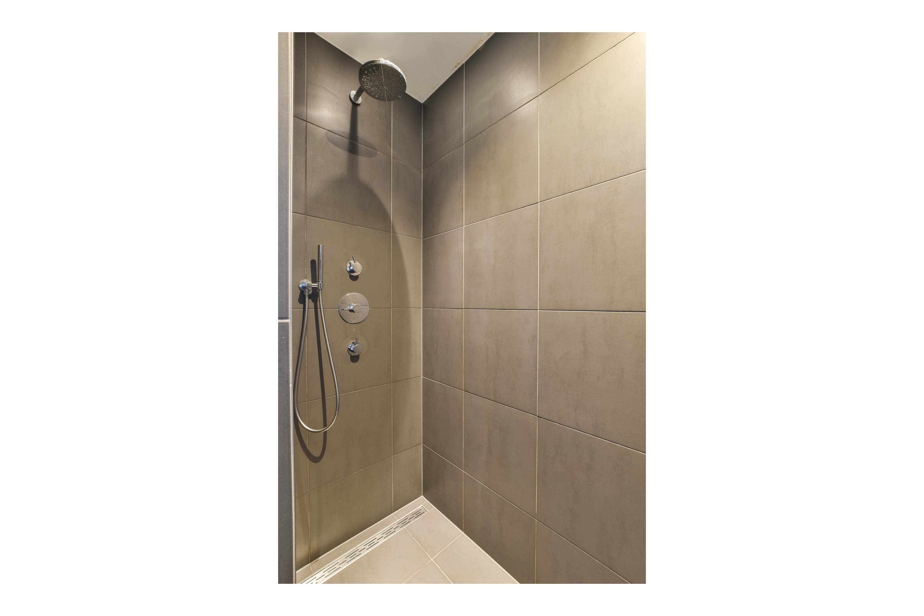 - The spacious master bedroom is quietly located at the rear of the apartment and features a large closet wall, space for a double bed, and an en-suite bathroom with a walk-in shower, sink, and towel radiator.