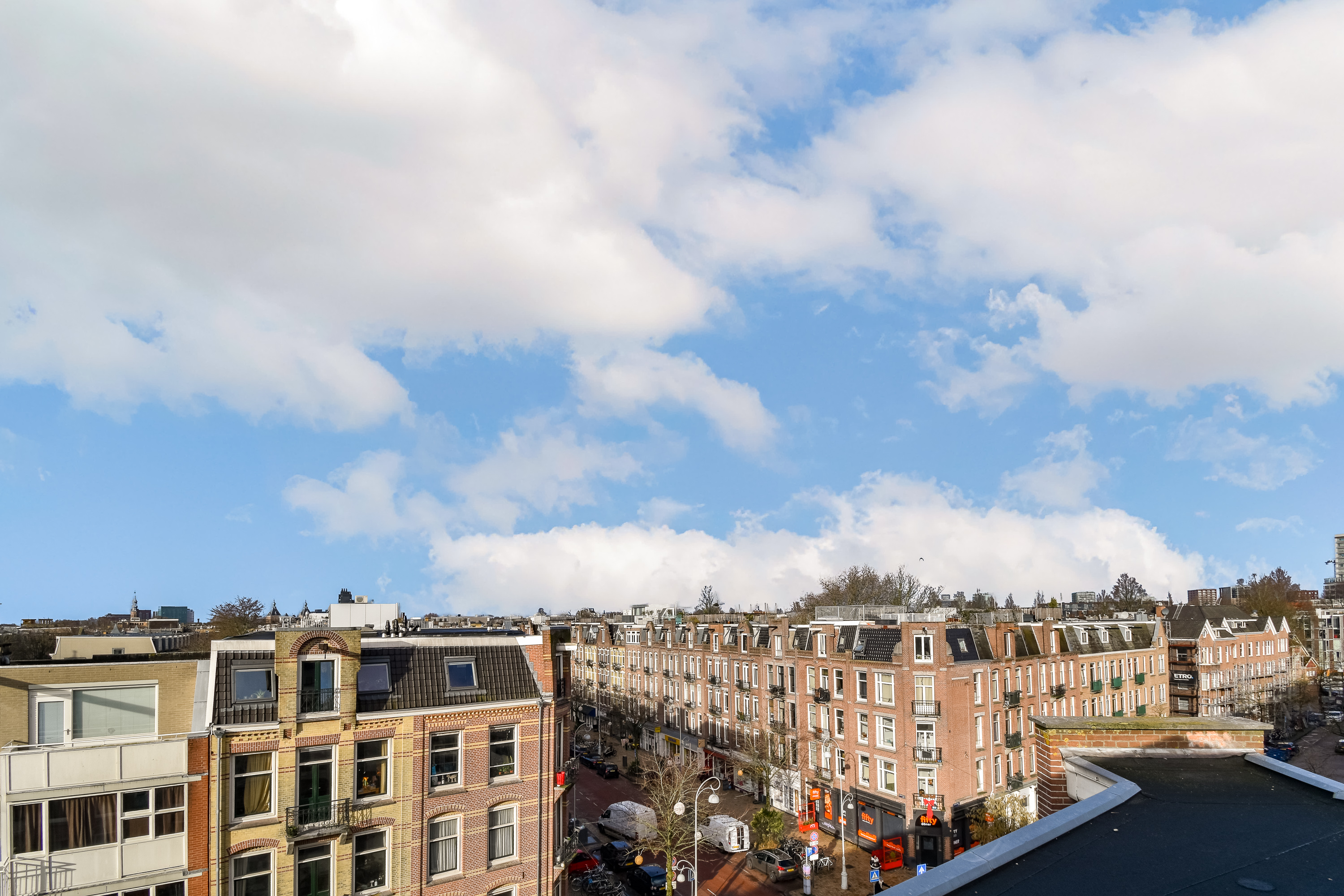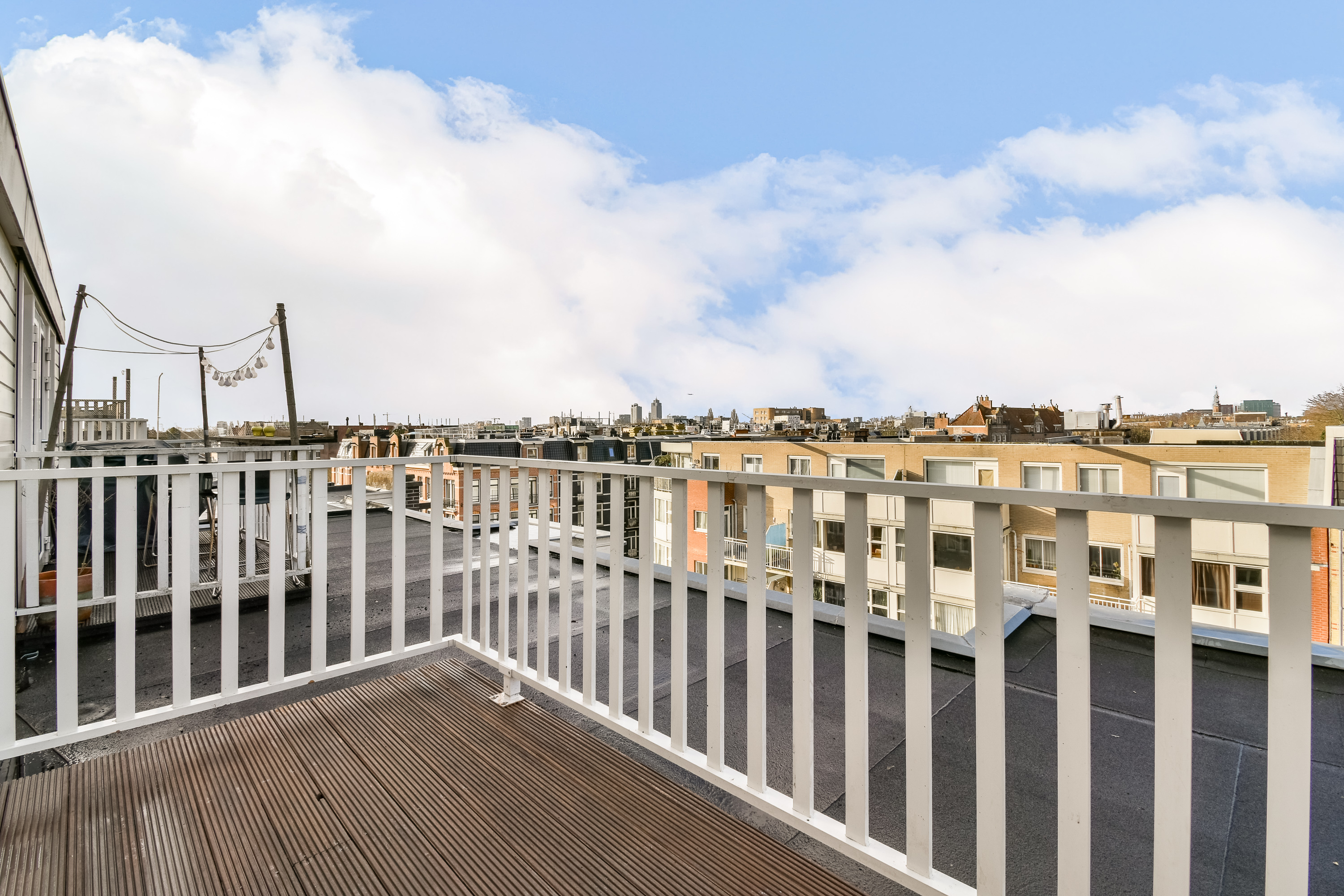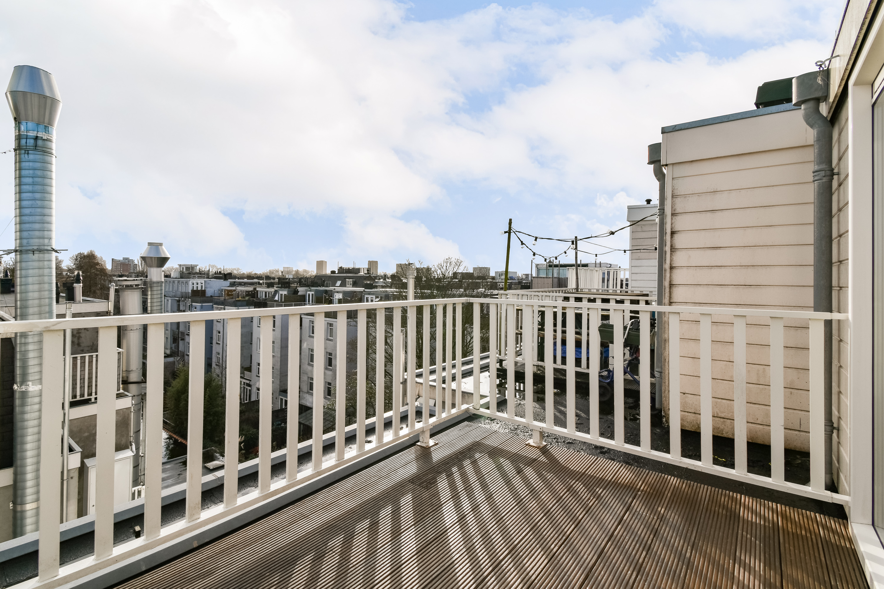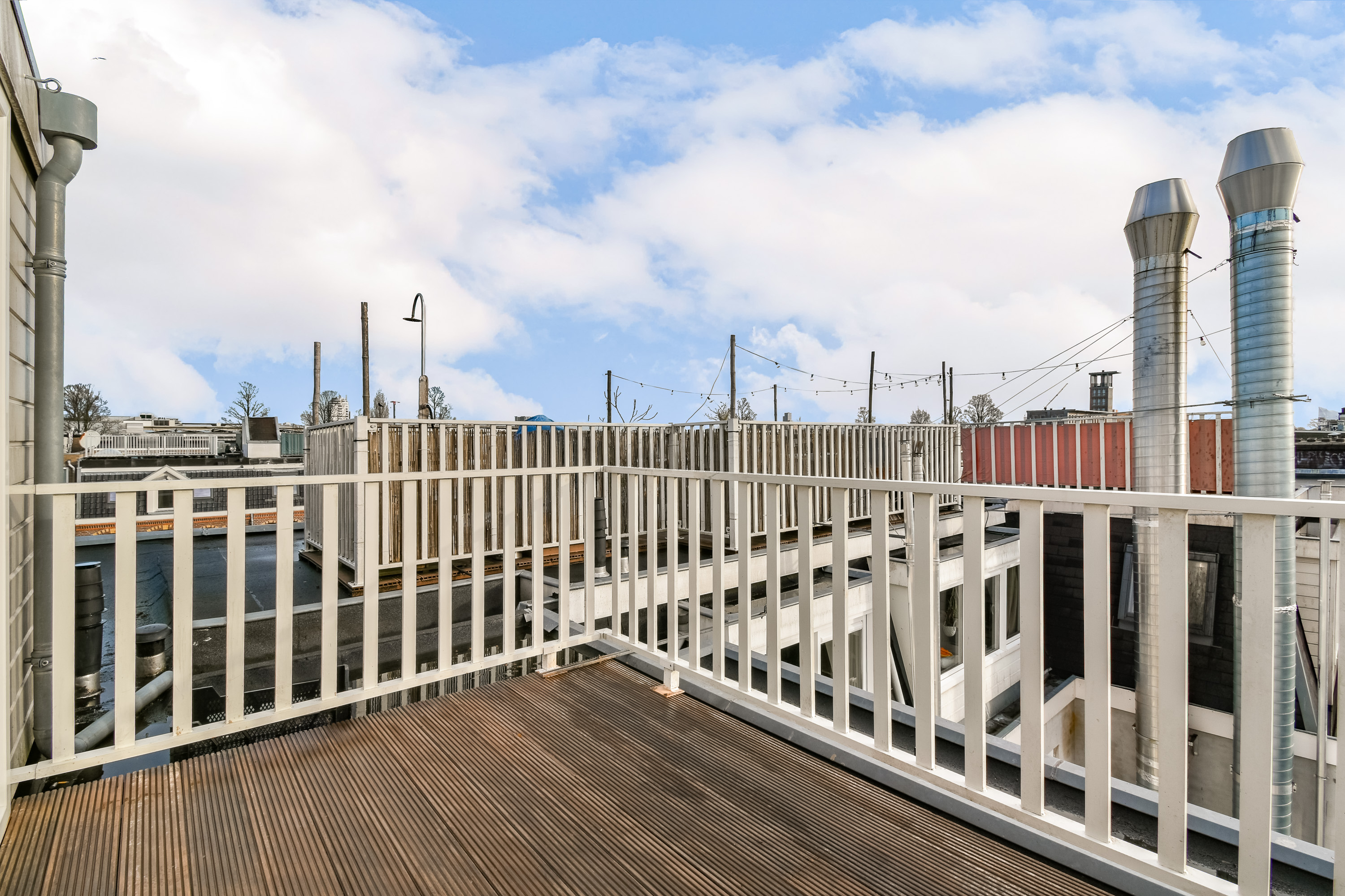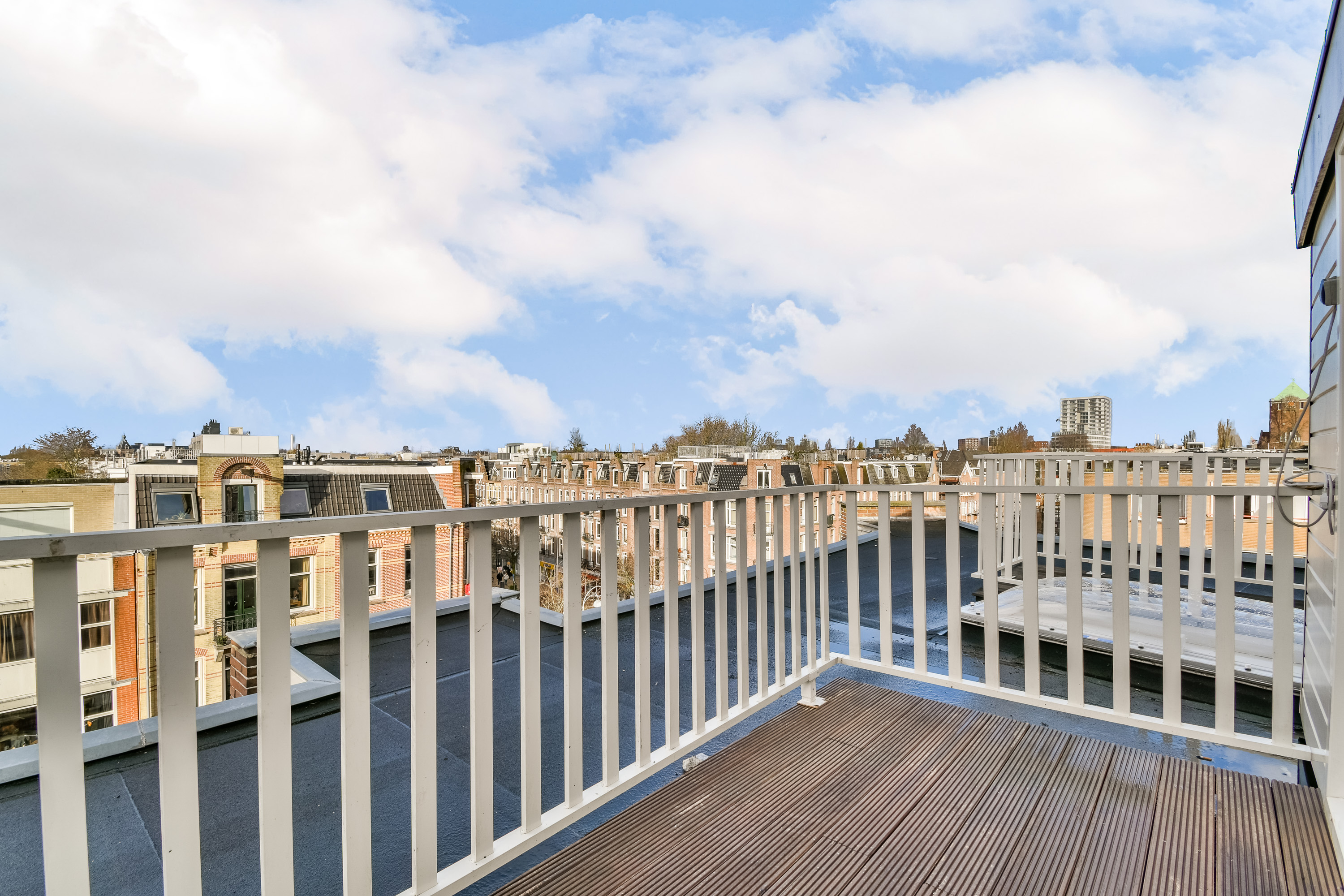 - Vanaf het dakterras uitzicht over de Sumatrastraat aan de voorzijde en de binnentuin aan de