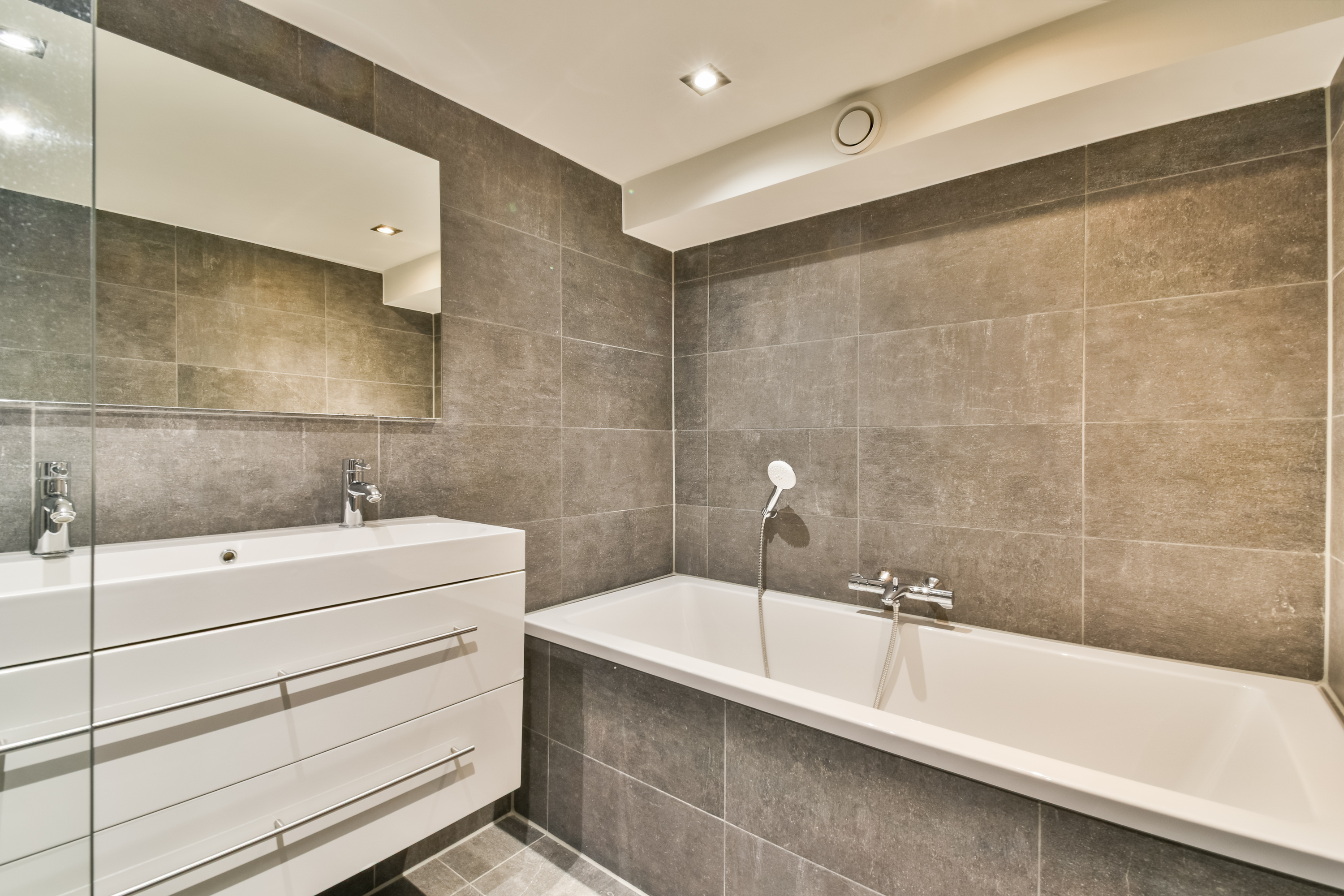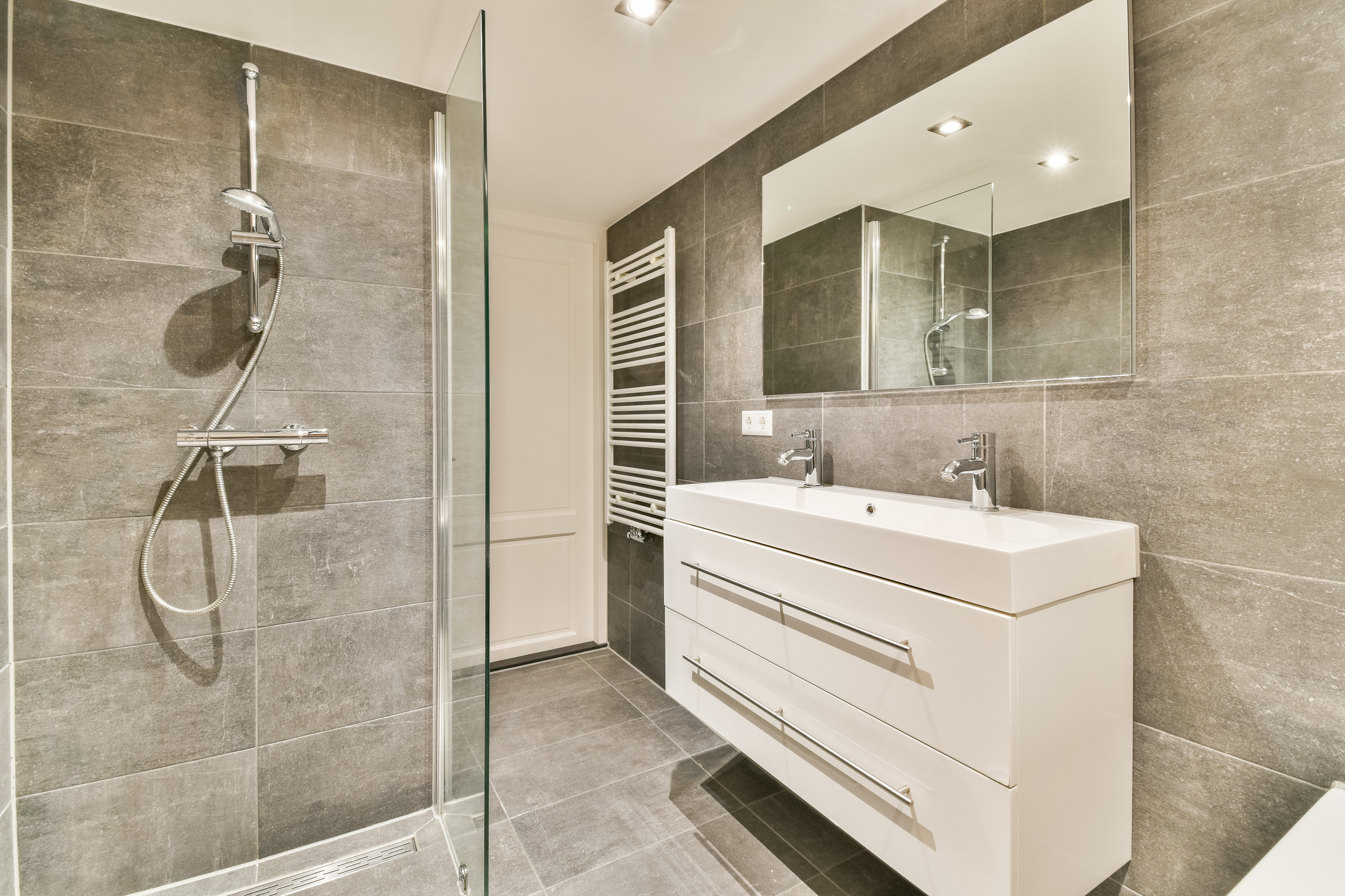 - The property features a neatly finished bathroom, including a double washbasin with drawers, walk-in shower, bathtub, and radiator;