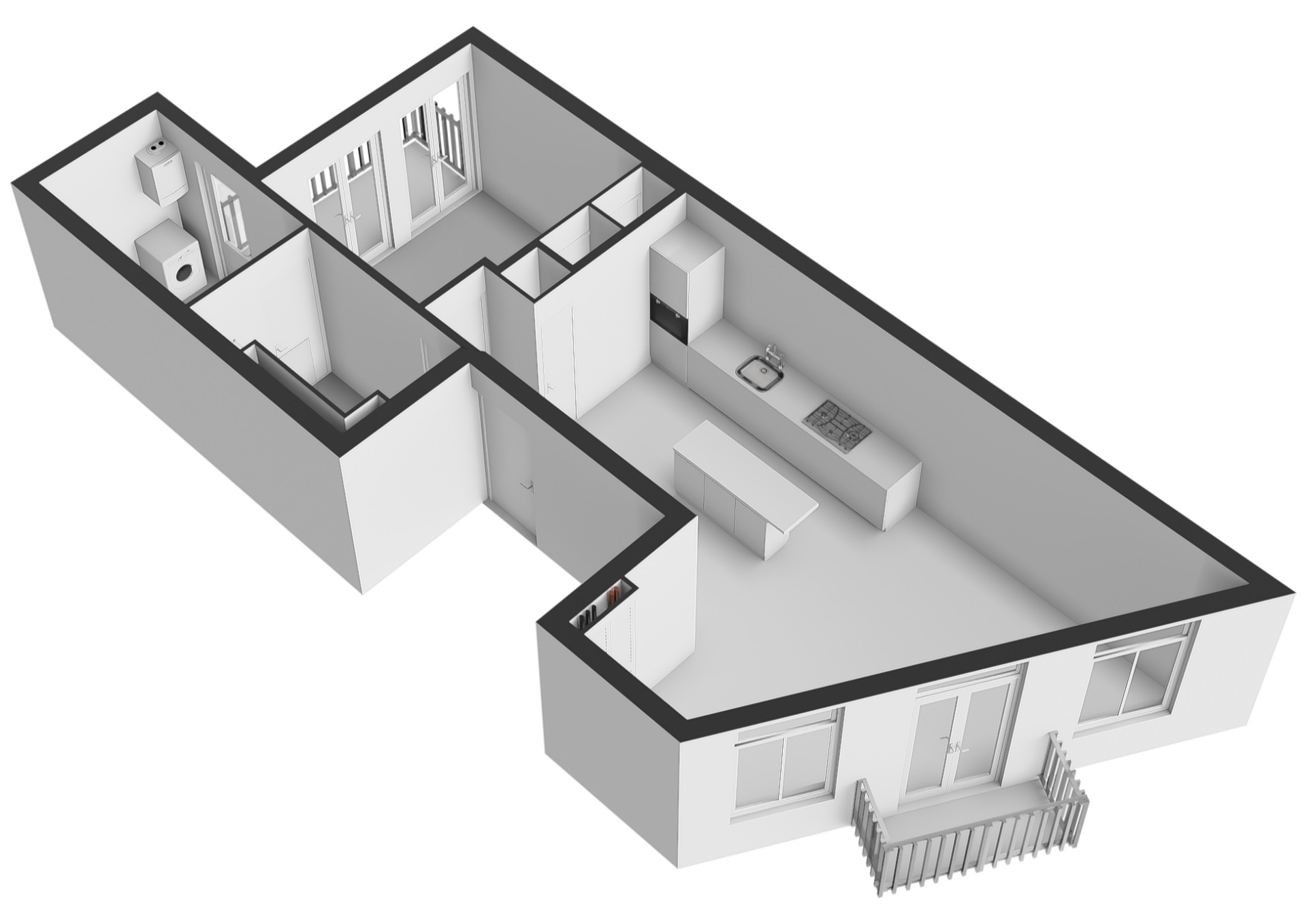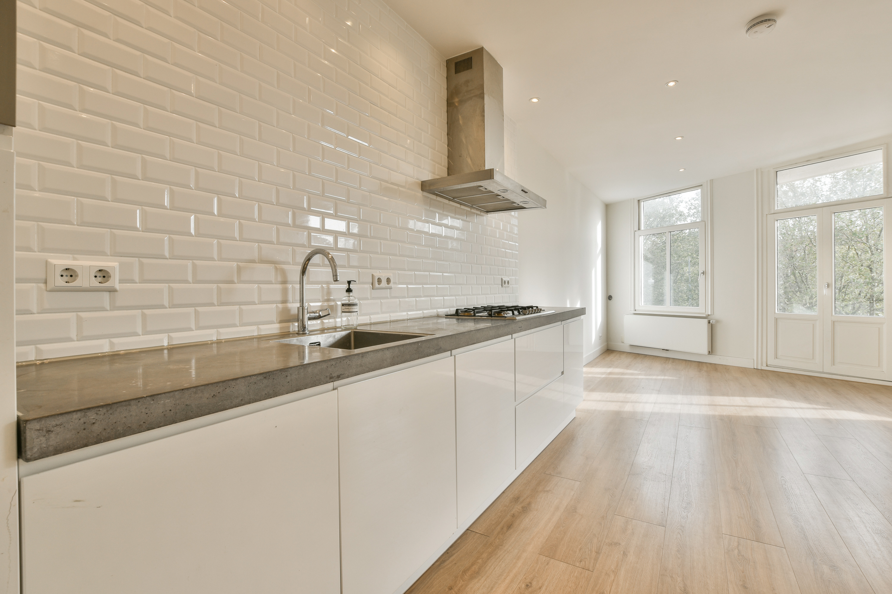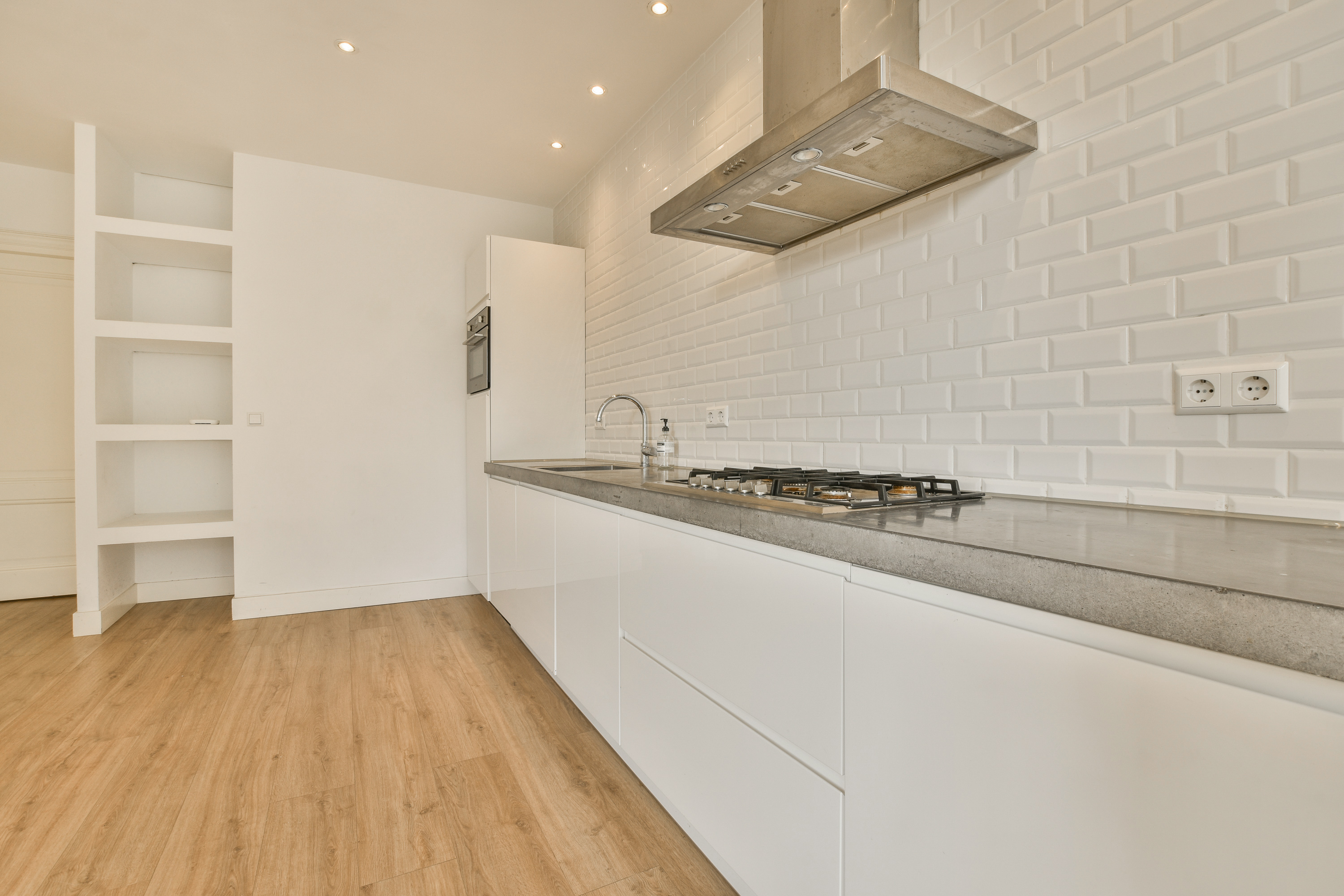 Dit alles afgewerkt met een stijlvol betonnen aanrechtblad en strakke witte kasten;