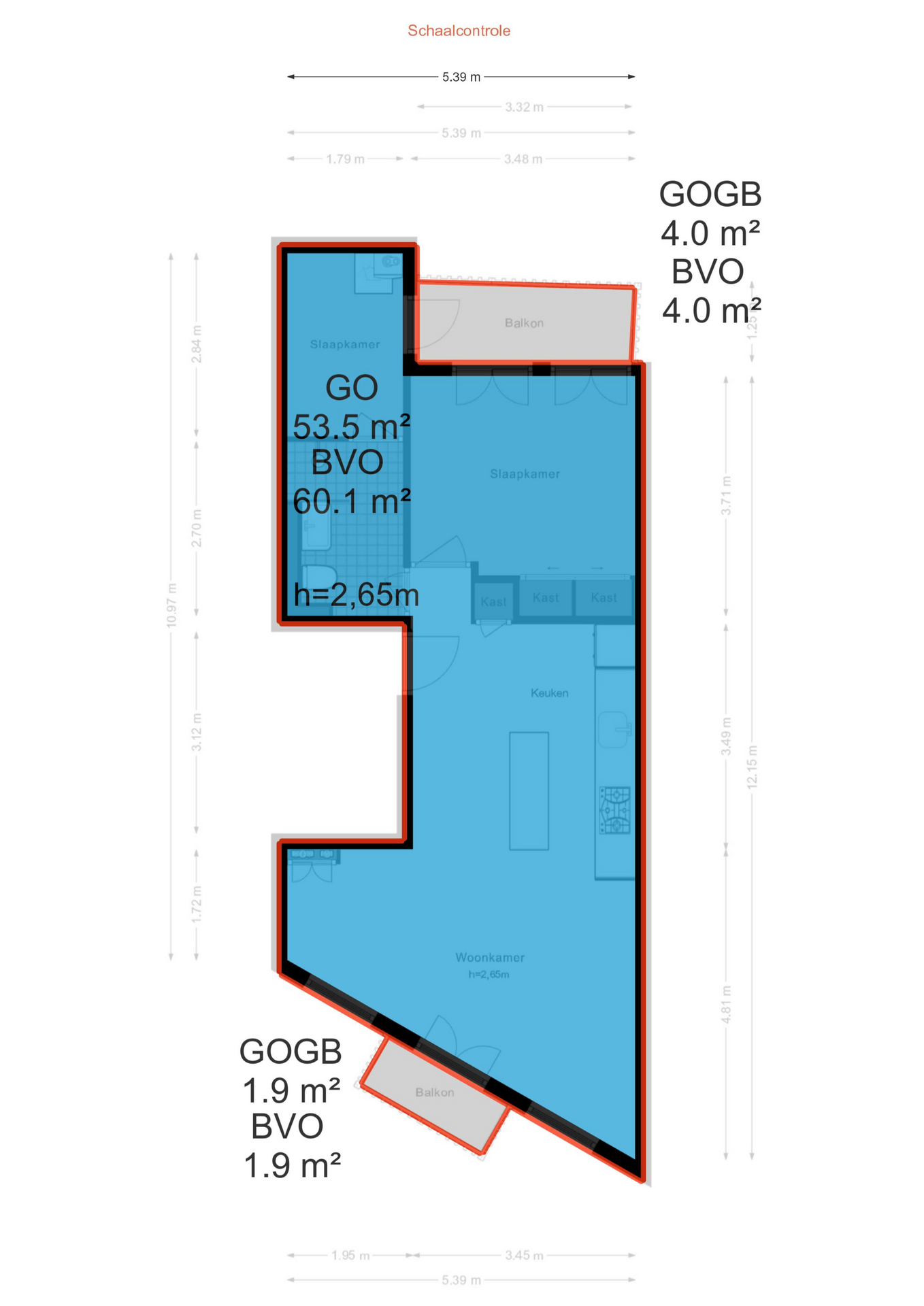 - De woonoppervlakte bedraagt 53,50 m²;