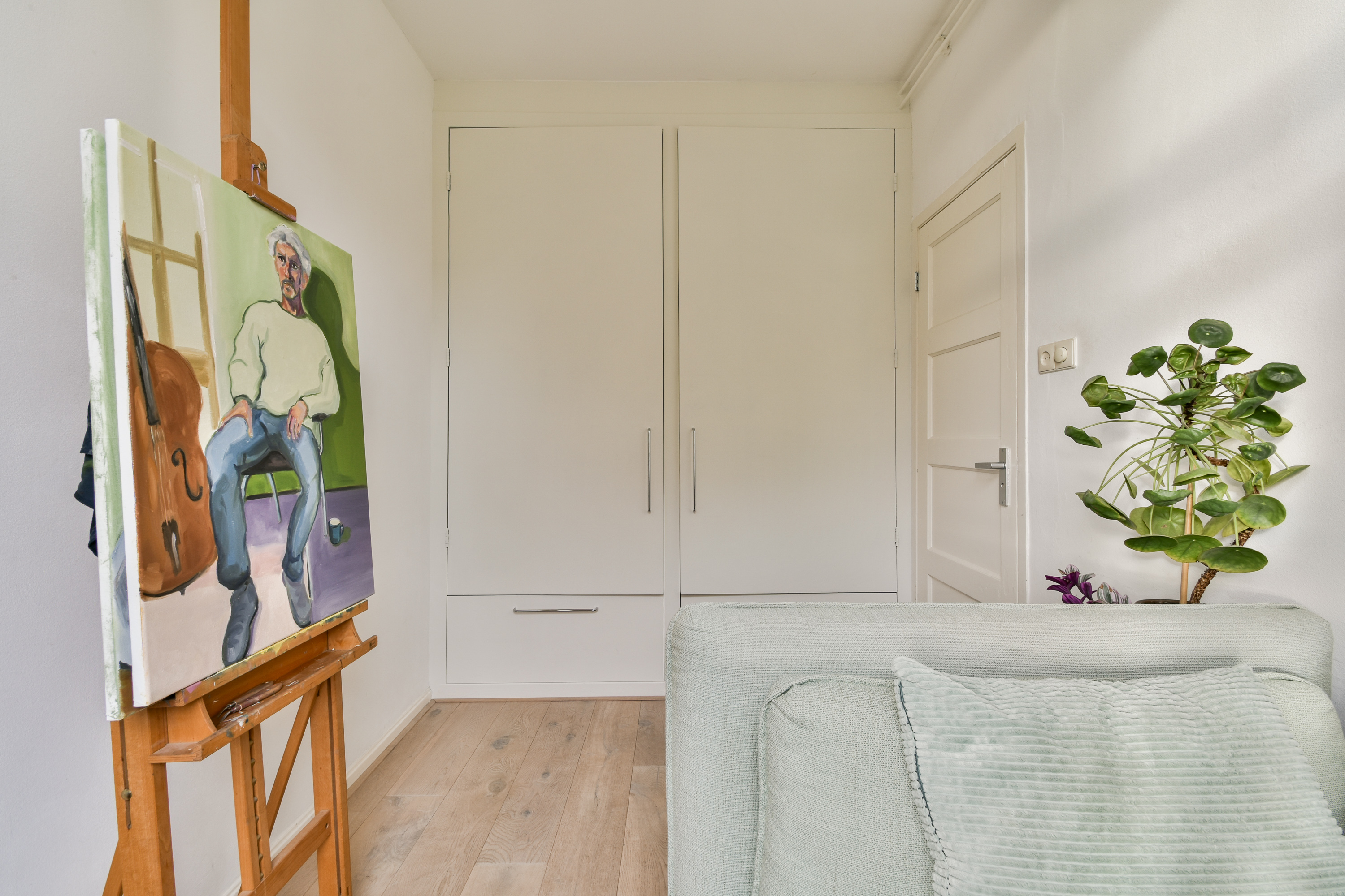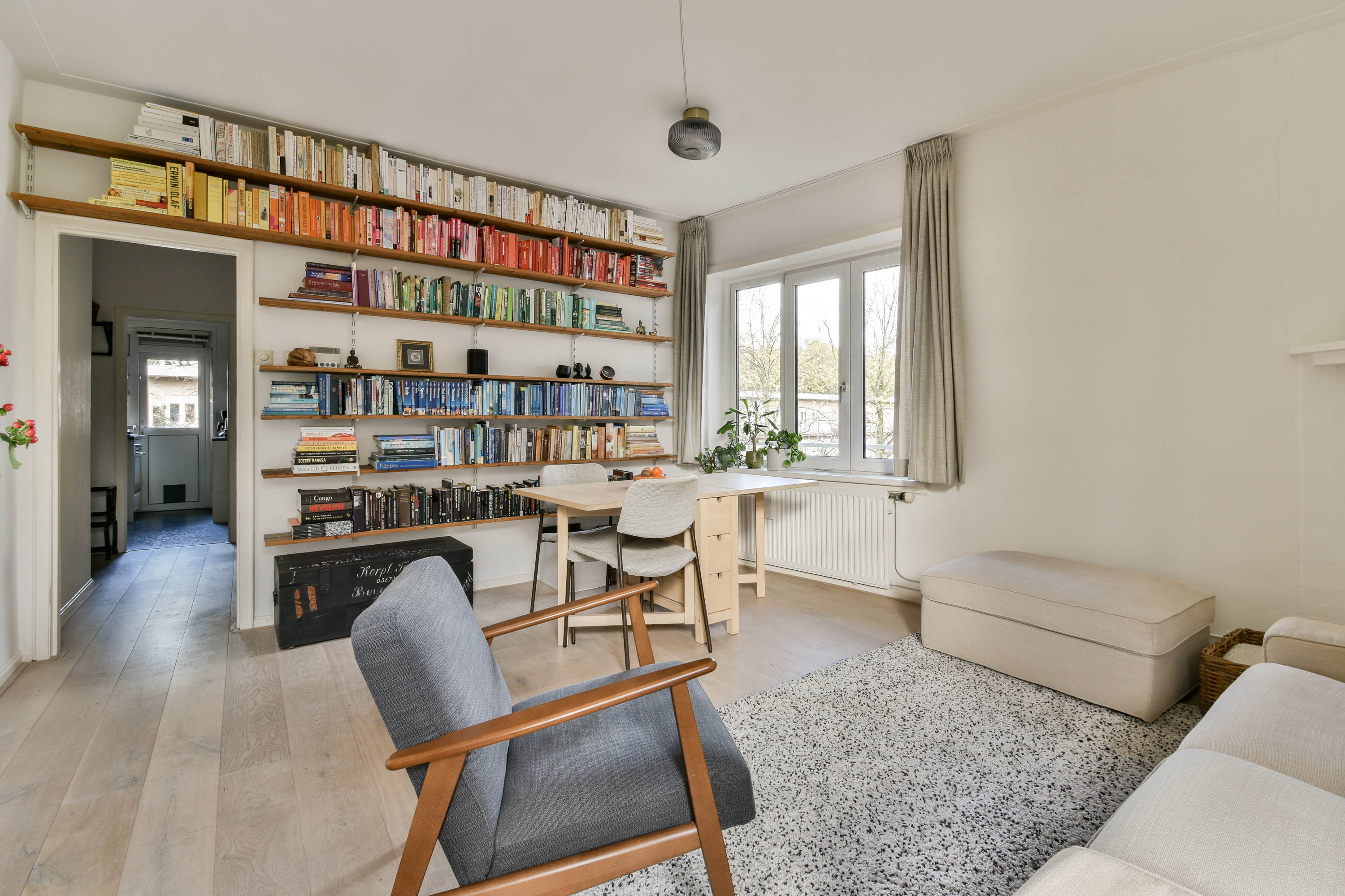 - Direct grenzend aan de woonkamer aan de voorzijde bevindt zich een slaapkamer met inbouwkasten die tevens als werkkamer te gebruiken is;