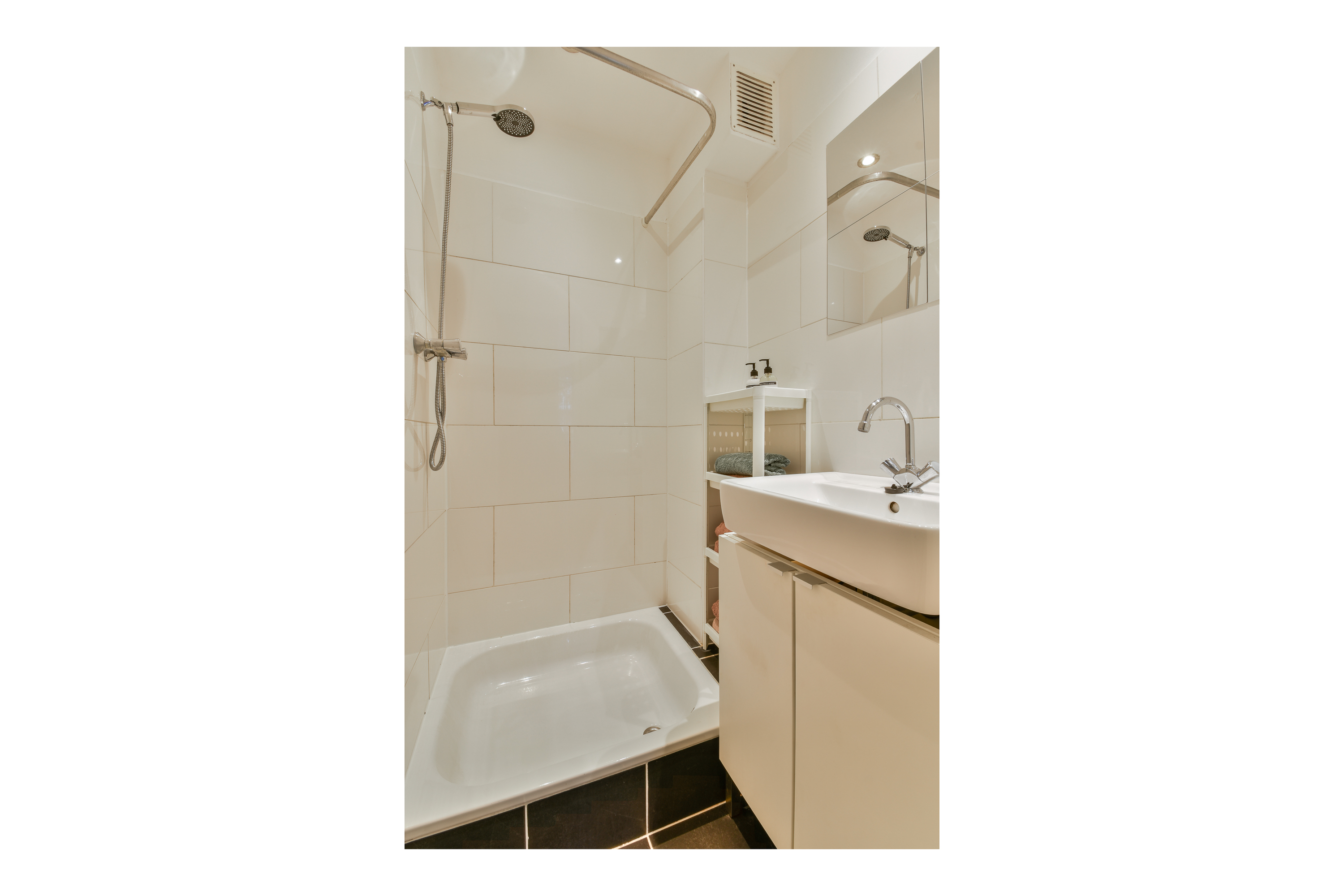 - Aangrenzend aan de slaapkamer bevindt zich de moderne badkamer met een inloopdouche en wastafelmeubel.